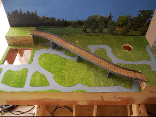 Le pont qui accueillera le petit train HOe, les planches et les clous sont réalisés avec le dos d'une lame de cutter et à l'aide de la pointe d'un compas.